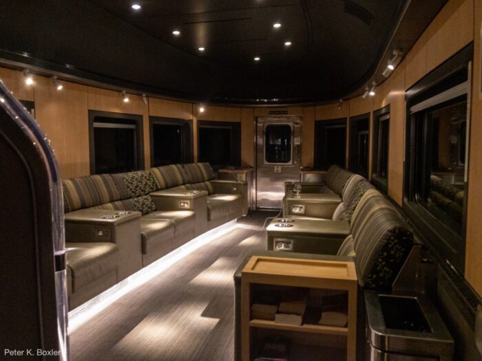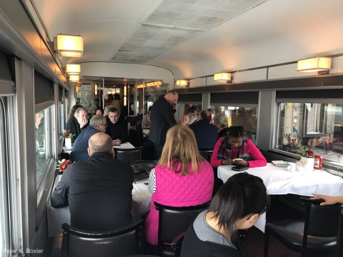 12. Februar, Erster Abend im Zug (nach gut 12 Std. Fahrt): Sitze im hintersten und schönsten Wagen (nicht nur wegen der Bar), siehe Foto, dort ist es sehr cosy. Draussen seit Stunden finstere Nacht – 3 andere Herren sitzen auch da, es ist erst nach 22 Uhr (last order um 23 Uhr) und bald wird die Zeit um eine Stunde zurückgestellt: wir kommen von Eastern Time nach Central Time.