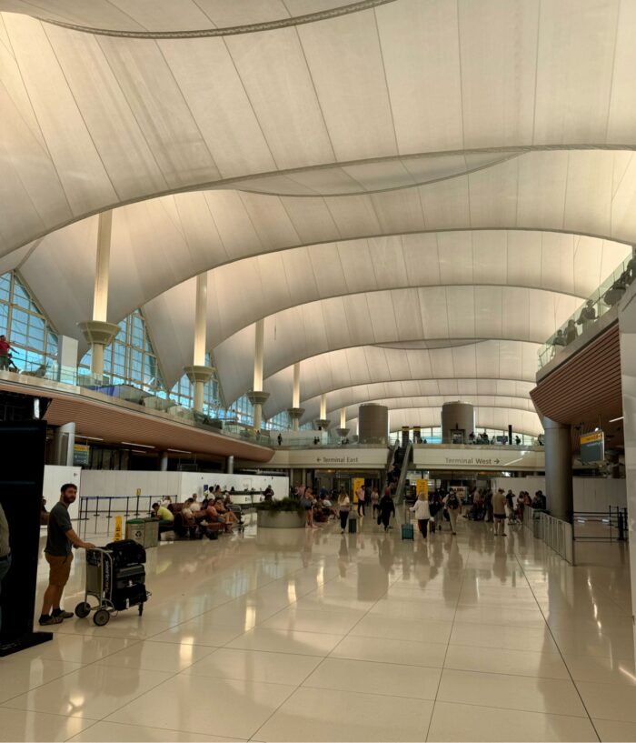 Security hinter mir – geht schnell, wenn man Business fliegt. Nun noch 3 Stunden warten und derweil über die Grösse dieses Fluhafens staunen. Hab dies gelesen: