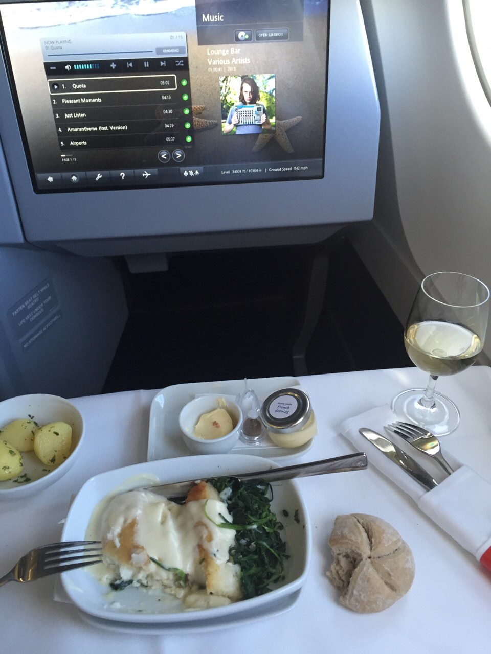 Unterwegs dies gedacht: Surreal – Klavierjazz im Kopfhörer, praktisch ohne Aussengeräusche dank noise cancelling, weisses Tischtuch, weisser Wein, draussen vor dem Fenster -56 Grad C und dies alles 10364 Meter über Meer. Zu all dem kommt noch die mehr gehörte denn gefühlte Vorwärtsgeschwindigkeit von 844 km pro Stunde, also etwa 230 Meter pro Sekunde. Dig this ! Der Sitz so ruhig wie daheim im Lehnstuhl – was der Mensch alles zustande bringt.