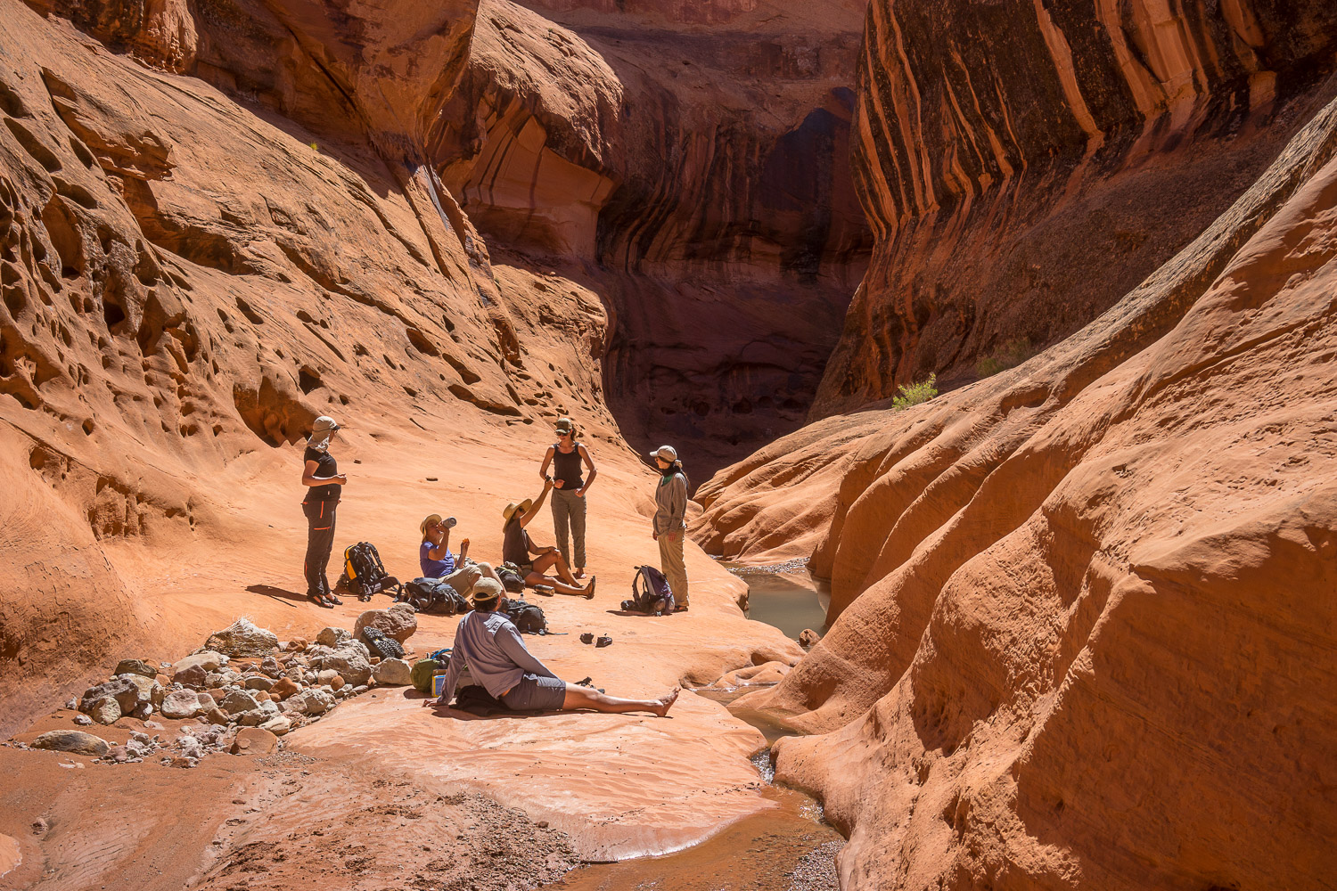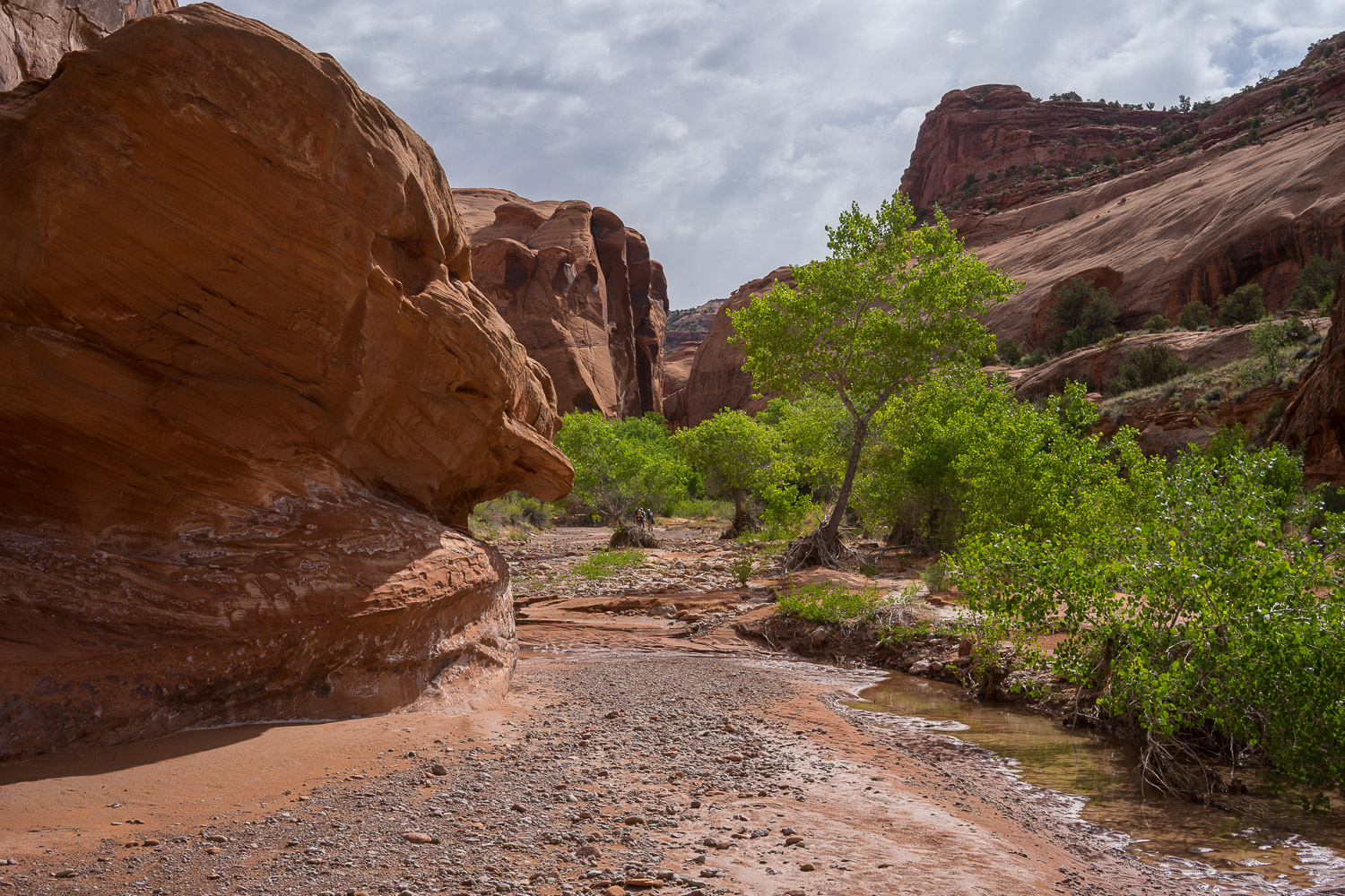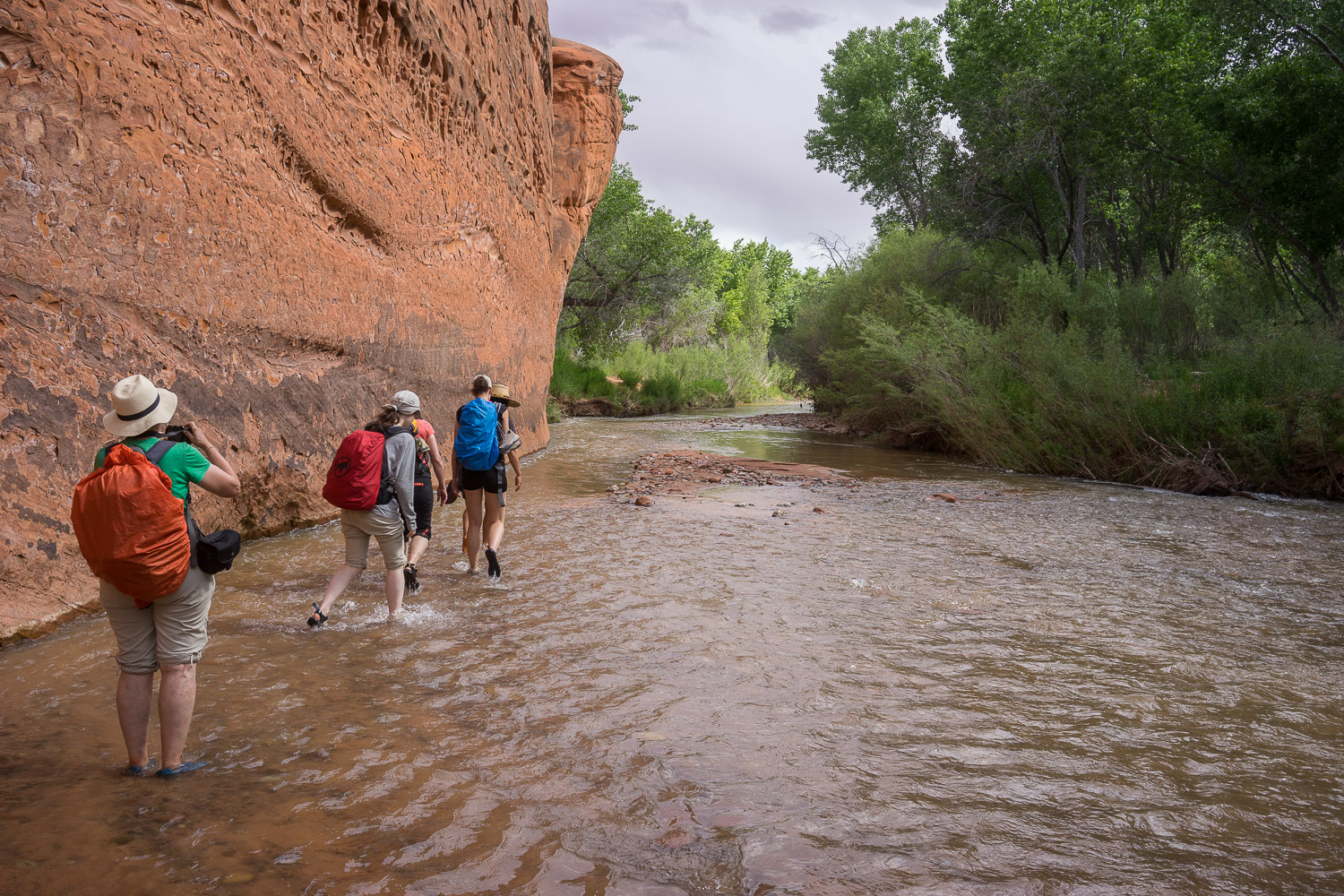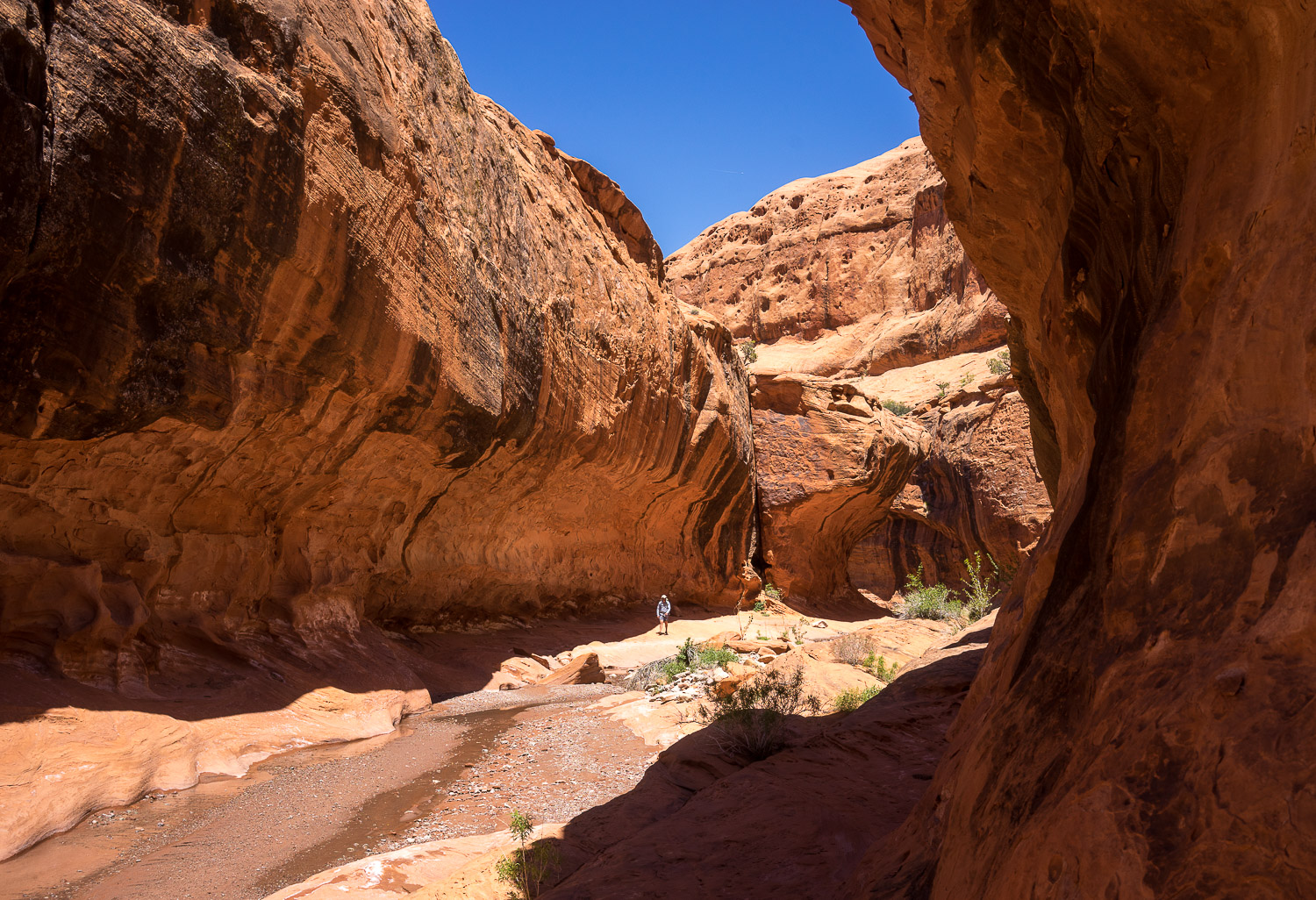 Der Trailhead, wo wir ein Auto abstellten, liegt ca. 50 Km südwärts von Escalante – auf diesen Weg über dirt-roads (Sand, Kies und Fels) weit und breit kein Haus zu sehen – trockene, unbewohnbare Halbwüste. Zuerst Abstieg ca. 350 Meter in die breite Schlucht des Escalante Rivers, Camp für 3 Tage einrichten und dann an zwei Tagen spannende Seitencanyons erkunden: Neon Canyon und den wunderbaren Choprock Canyon. Auf dem Weg zu diesen Seitencanyons jeweils 2-3 mal den Fluss überqueren – alles im Video auf YouTube zu sehen. Wasserstand niedrig bis mittel, Wasser aber trübe, ohne Sicht auf den Grund.