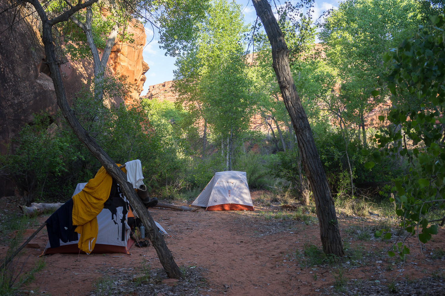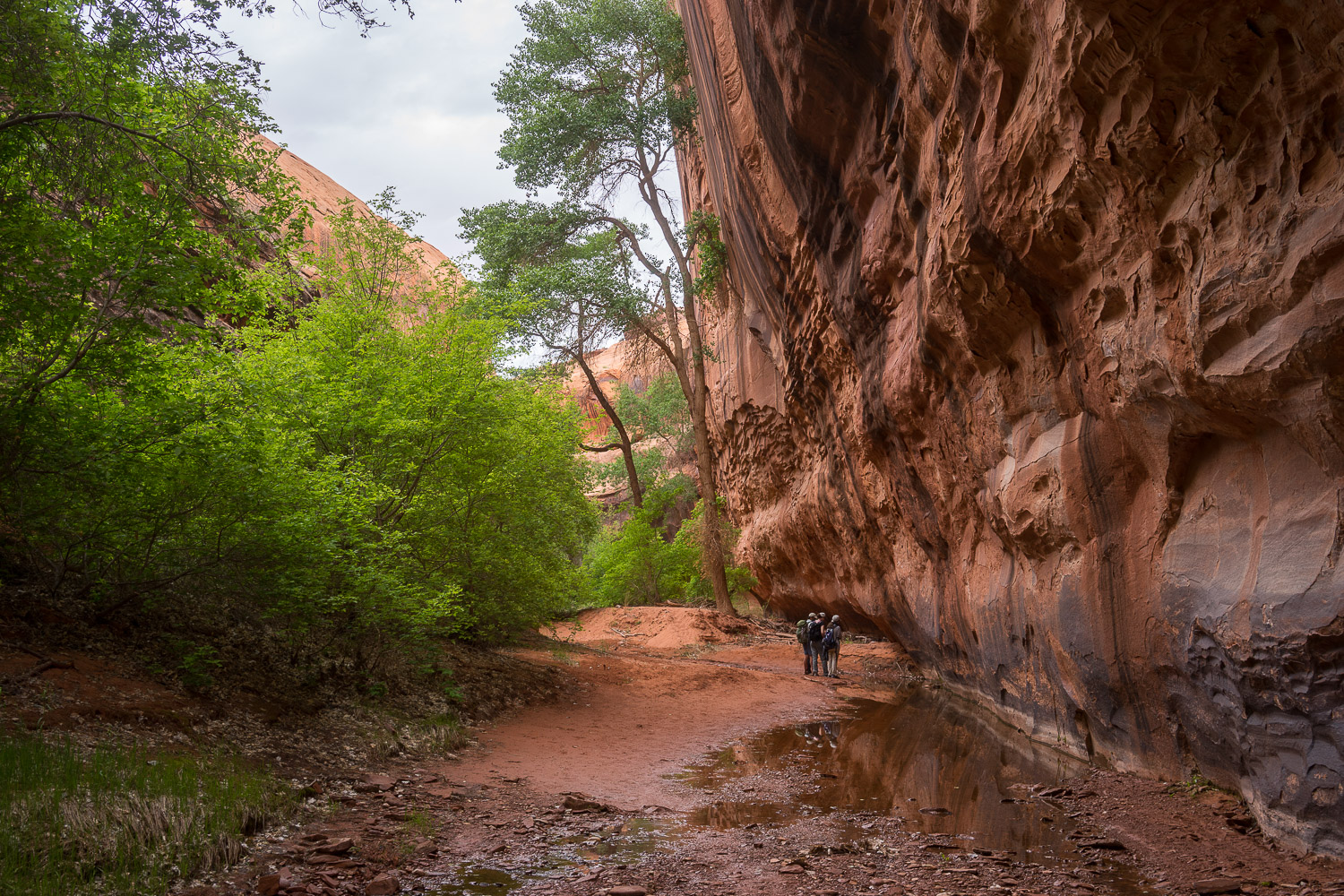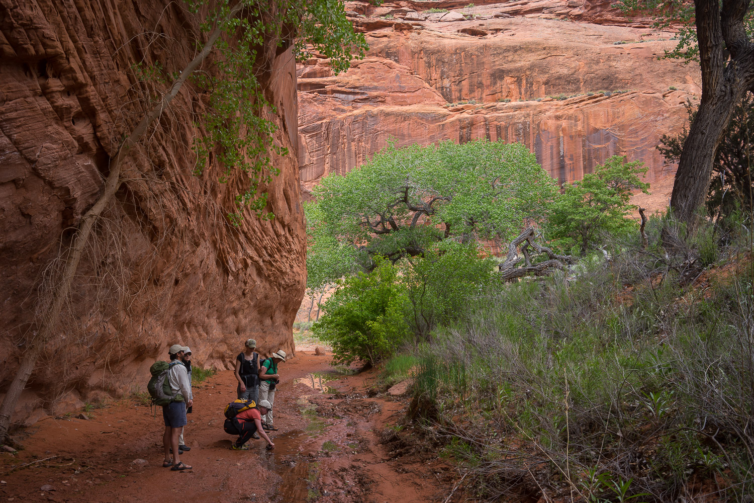 Der Trailhead, wo wir ein Auto abstellten, liegt ca. 50 Km südwärts von Escalante – auf diesen Weg über dirt-roads (Sand, Kies und Fels) weit und breit kein Haus zu sehen – trockene, unbewohnbare Halbwüste. Zuerst Abstieg ca. 350 Meter in die breite Schlucht des Escalante Rivers, Camp für 3 Tage einrichten und dann an zwei Tagen spannende Seitencanyons erkunden: Neon Canyon und den wunderbaren Choprock Canyon. Auf dem Weg zu diesen Seitencanyons jeweils 2-3 mal den Fluss überqueren – alles im Video auf YouTube zu sehen. Wasserstand niedrig bis mittel, Wasser aber trübe, ohne Sicht auf den Grund.