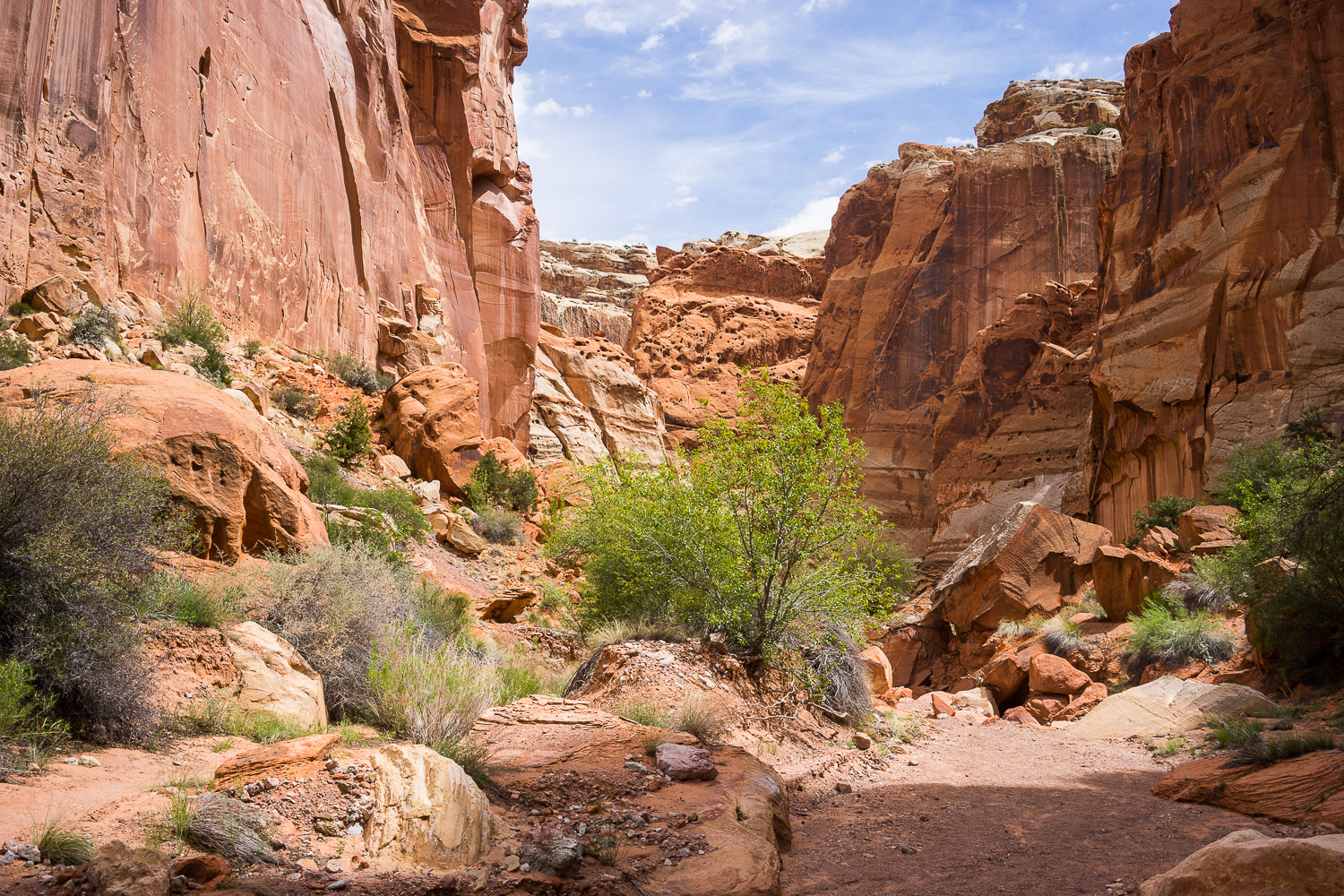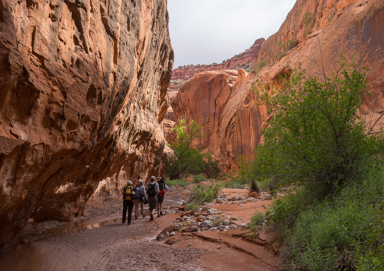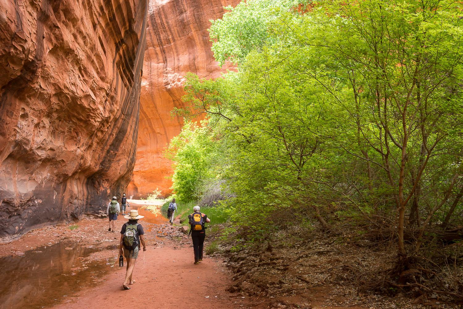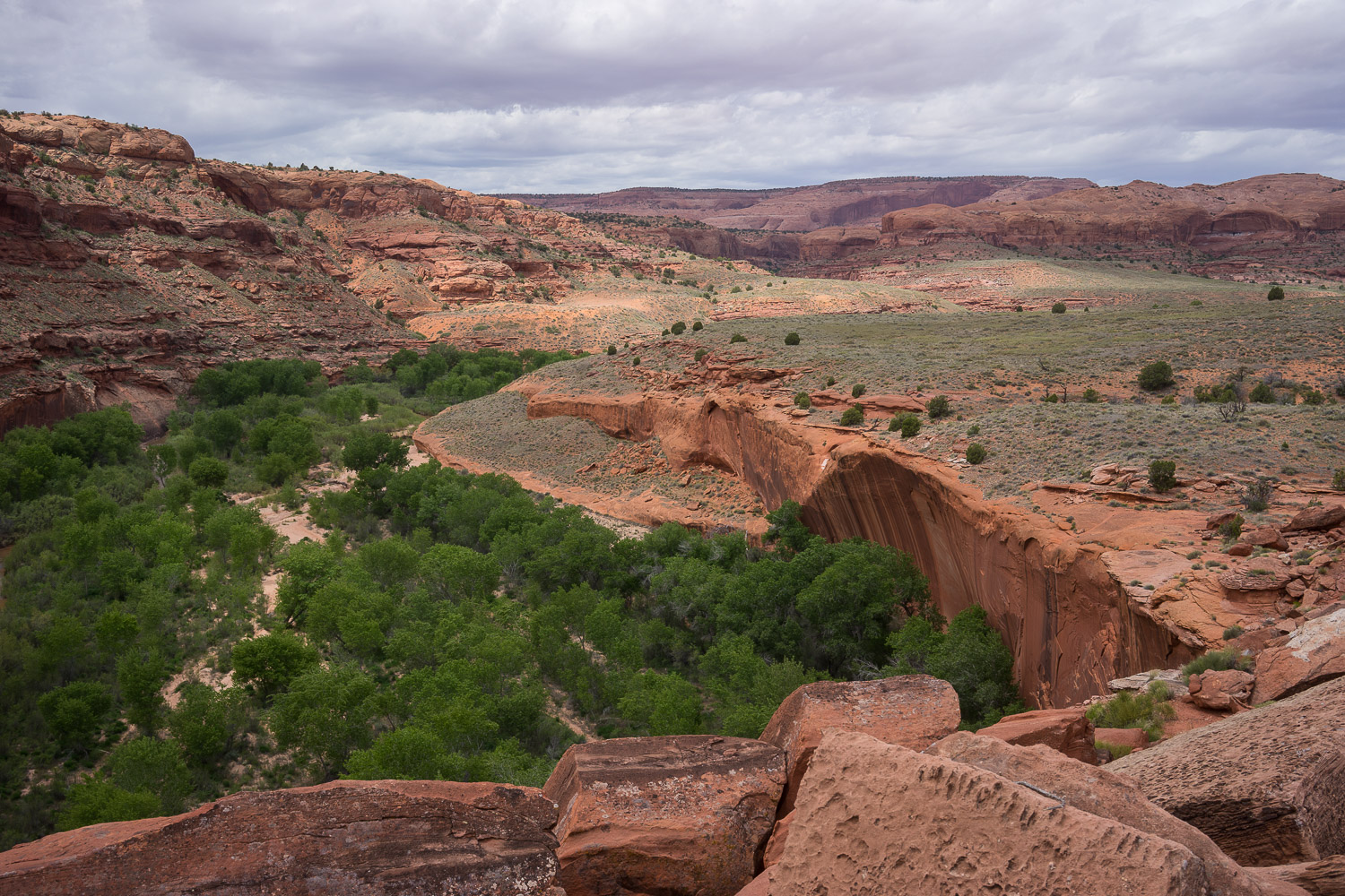 Der Trailhead, wo wir ein Auto abstellten, liegt ca. 50 Km südwärts von Escalante – auf diesen Weg über dirt-roads (Sand, Kies und Fels) weit und breit kein Haus zu sehen – trockene, unbewohnbare Halbwüste. Zuerst Abstieg ca. 350 Meter in die breite Schlucht des Escalante Rivers, Camp für 3 Tage einrichten und dann an zwei Tagen spannende Seitencanyons erkunden: Neon Canyon und den wunderbaren Choprock Canyon. Auf dem Weg zu diesen Seitencanyons jeweils 2-3 mal den Fluss überqueren – alles im Video auf YouTube zu sehen. Wasserstand niedrig bis mittel, Wasser aber trübe, ohne Sicht auf den Grund.