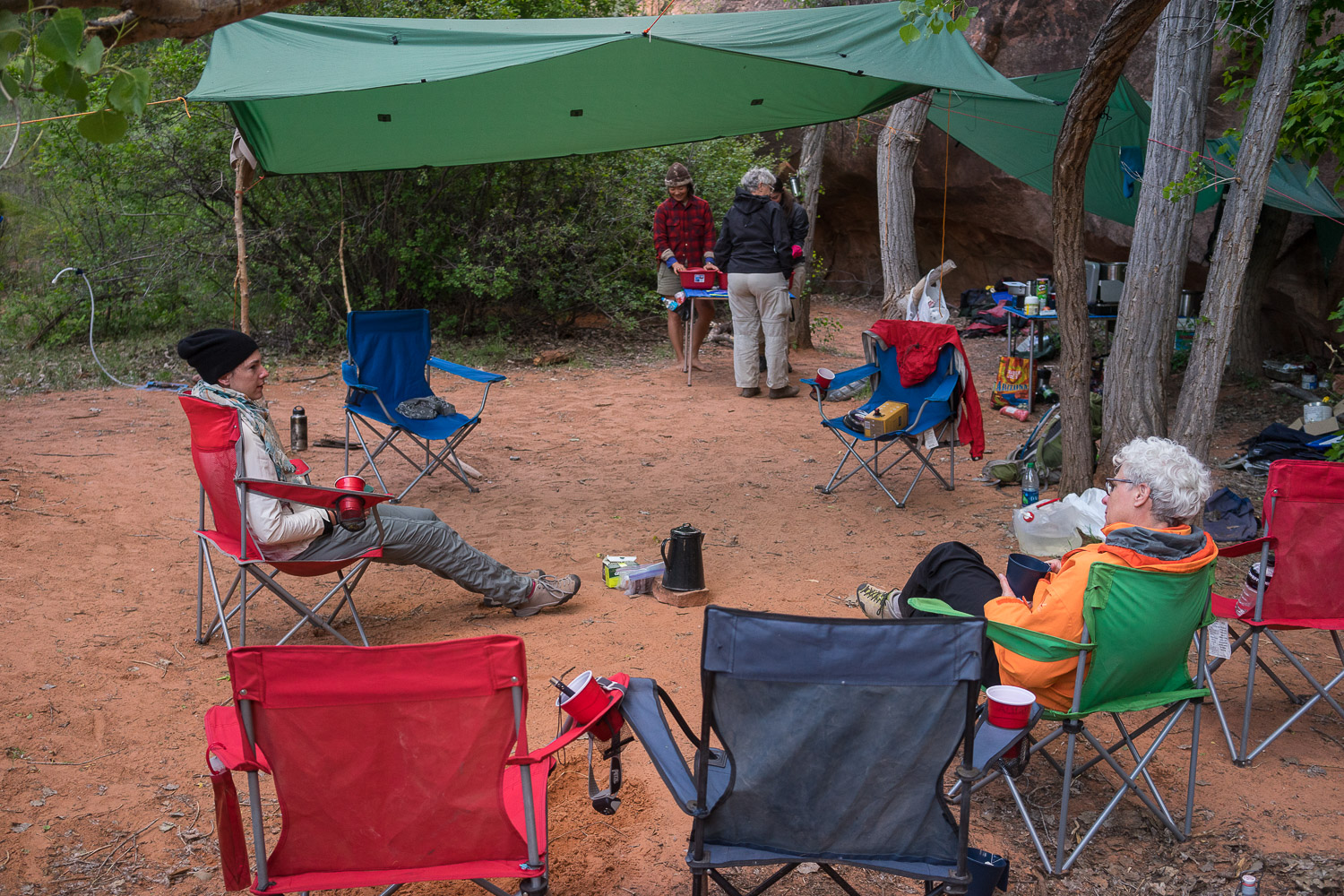 Bei solchen Outdoor-Aktivitäten spielt das Wetter eine entscheidende Rolle – wir hatten Glück: mit wenigen kurzen und leichten Regen-Hickups wars immer sonnig mit oft dramatischen Wolken am blauen Himmel. Temperatur angenehm, beim Aus-dem-Zelt-kriechen (ca. 6.45 Uhr) zeigte das Quecksilber so um die 9 Grad. Ertragbar, speziell wenn die Guides den Kaffee schon bereit haben. Kaffee vorzüglich, mit French Press bereitet. Tagsüber und speziell bei steilen Aufstiegen zudem auch immer ein passender, leichter Wind. Wir sind in den 4 Tagen viel gewandert, total ca. 15 Stunden, zum Teil über schwieriges Terrain und nicht wenig im Wasser. An einem Tag waren wir 8 Stunden unterwegs, davon sicher 6 laufend und kraxelnd.