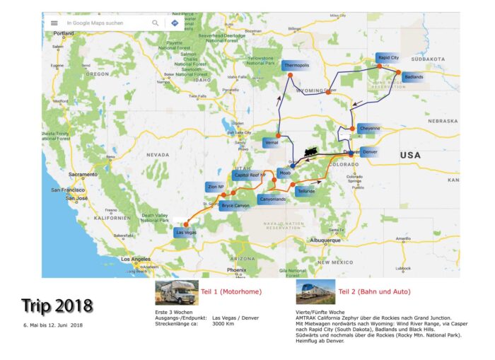 Wir fliegen mit Edelweiss Air nach Las Vegas (ist einzige Edelweiss Destination im Südwesten), am dritten Tag geht es los mit dem 23ft Motorhome gegen die Nationalparks in Utah. Endpunkt des 21-Tage Motorhome-Trips wird Denver sein. Danach eine Fahrt mit dem California Zephyr wieder westwärts über die Rocky Mountains nach Grand Junction. Ab dort mit einem PW nordwärts nach Wyoming und South Dakota. Die Reise endet in Denver Colorado. Motto: Von allem ein bisschen…
